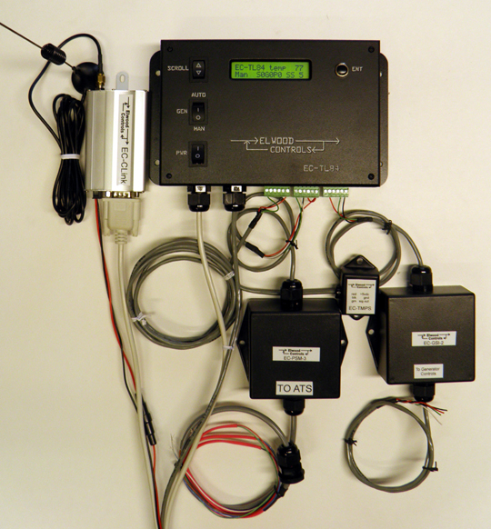 with user interface. (1) EC-TMPS temperature sensor. (1) EC-PSM-3 power source monitoring module. (1) EC-GSI-1 single output generator starting interface. (1) EC-CLink cellular modem with antenna. Possible applications for the EC-TL84: 1) Remote unattended